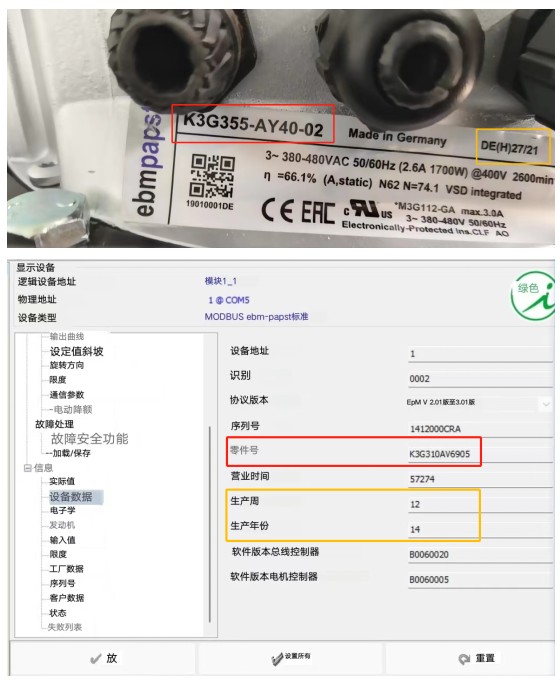 我們來看這個風機銘牌上型號是:K3G355-AY40-02,通過軟件讀取,可以看到風機原本的型號是K3G310-AV69-05,而且出廠時間與銘牌不相符。